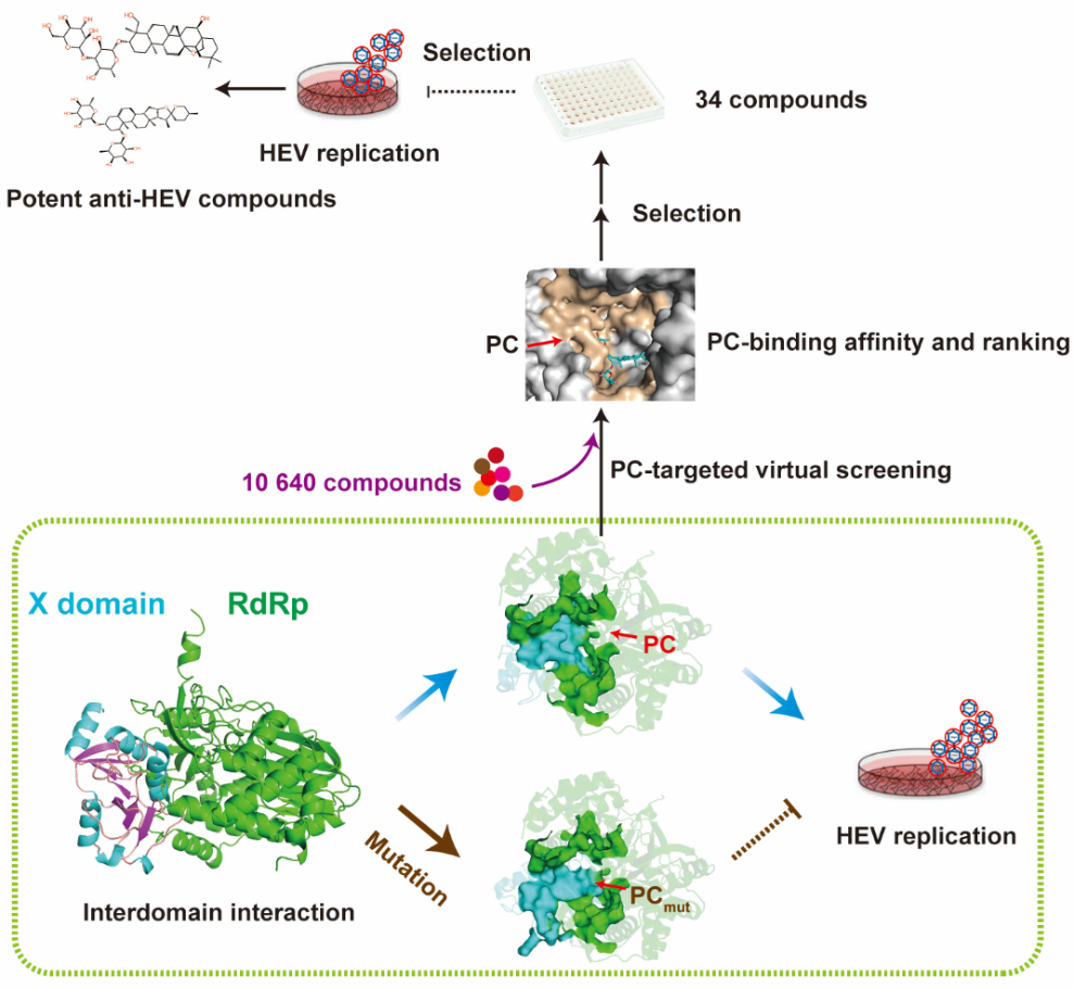 该研究首次揭示了HEV ORF1多聚蛋白中一个全新结构—X结构域与RNA依赖性RNA聚合酶(RdRp)之间形成的“口袋状空腔”。功能实验证实,该“口袋”对病毒复制不可或缺;基于此发现,进一步构建了针对该“口袋”的高通量虚拟筛选平台,验证了“靶向病毒蛋白界面空腔”可作为高效的抗病毒新策略。